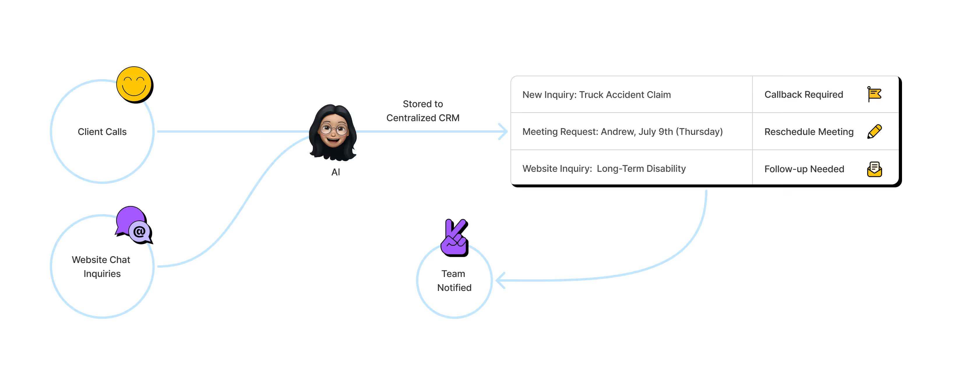 We integrated an AI-powered receptionist and website chatbot to modernize how CLG Injury Law connects with clients. The receptionist answers calls instantly, captures inquiries after hours, and ensures no potential client is ever left waiting. The website chatbot handles initial questions, qualifies leads, and provides a consistent digital touchpoint across all six office locations. Every interaction flows directly into the firm's CRM, notifying the team right away so follow-ups happen faster and no opportunity is missed.