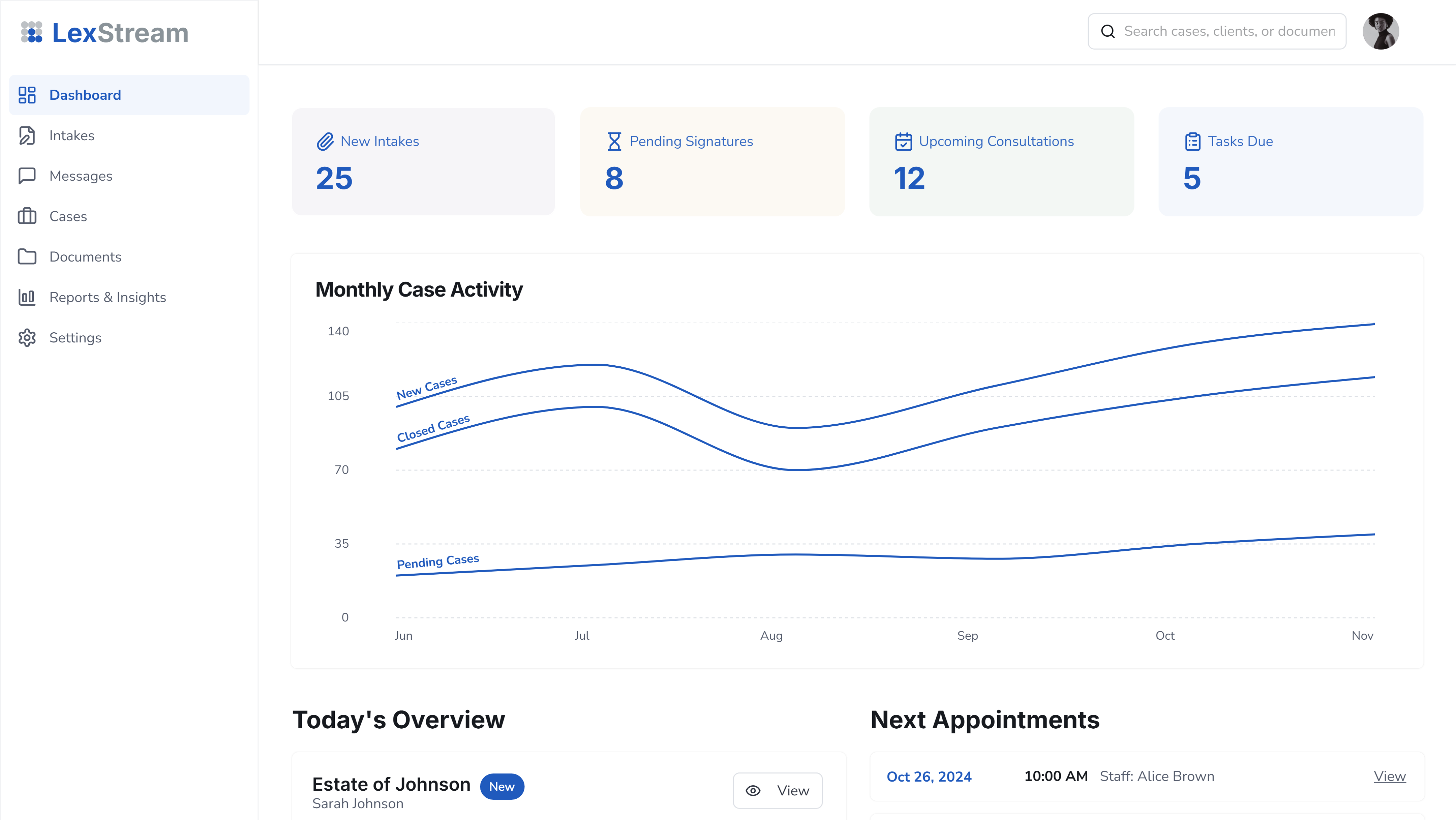 Reports & Insights:Interactive charts visualize case conversion rates, average signature times, and pending workload by owner or practice area.