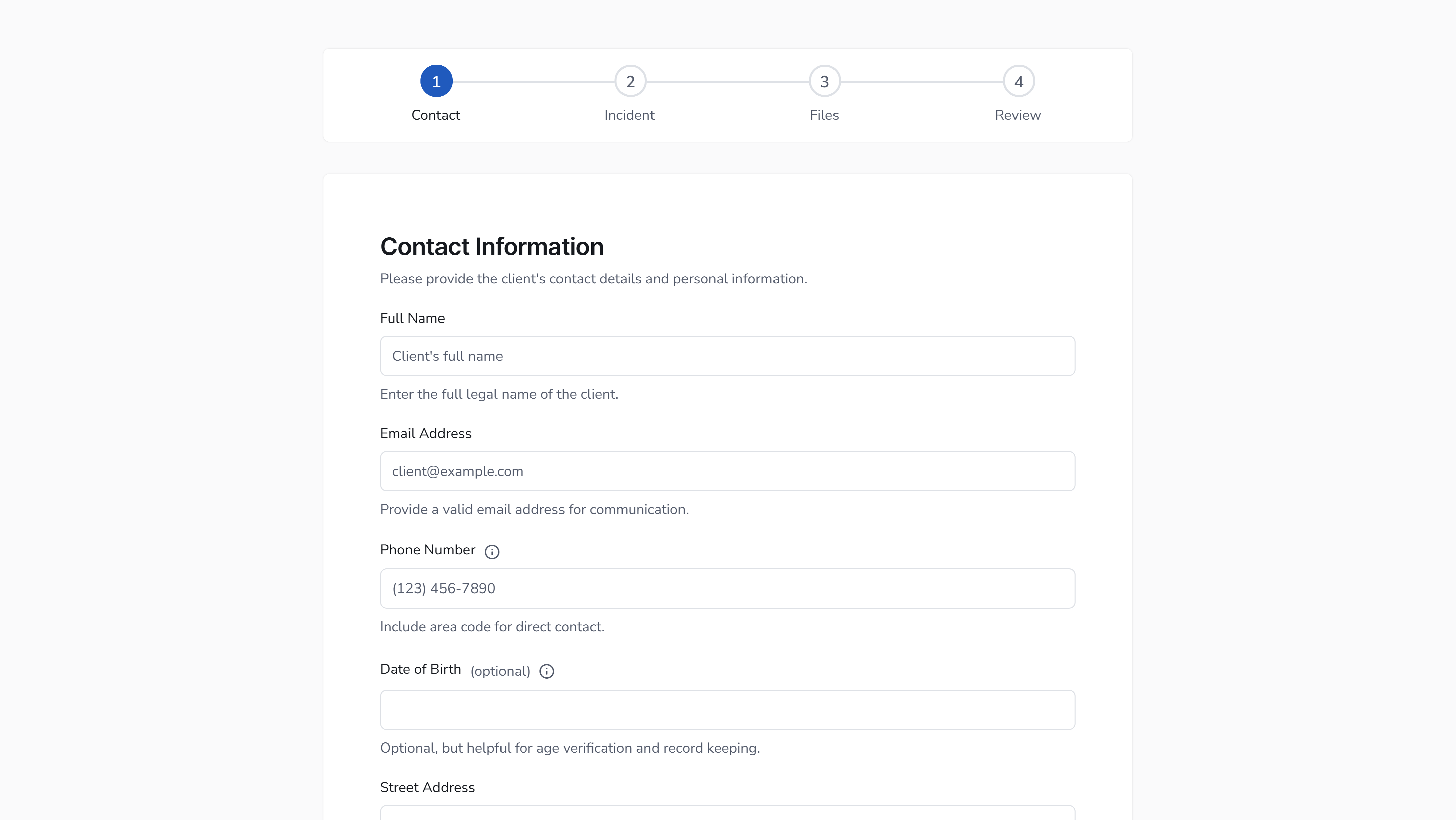 Client Intake Form: A guided, step-by-step process for collecting client details and case information. Smart progress indicators, autosave, and contextual help ensure forms are completed accurately without overwhelming the user. Client Intake Form transforms the first point of contact into a smooth, guided digital experience.