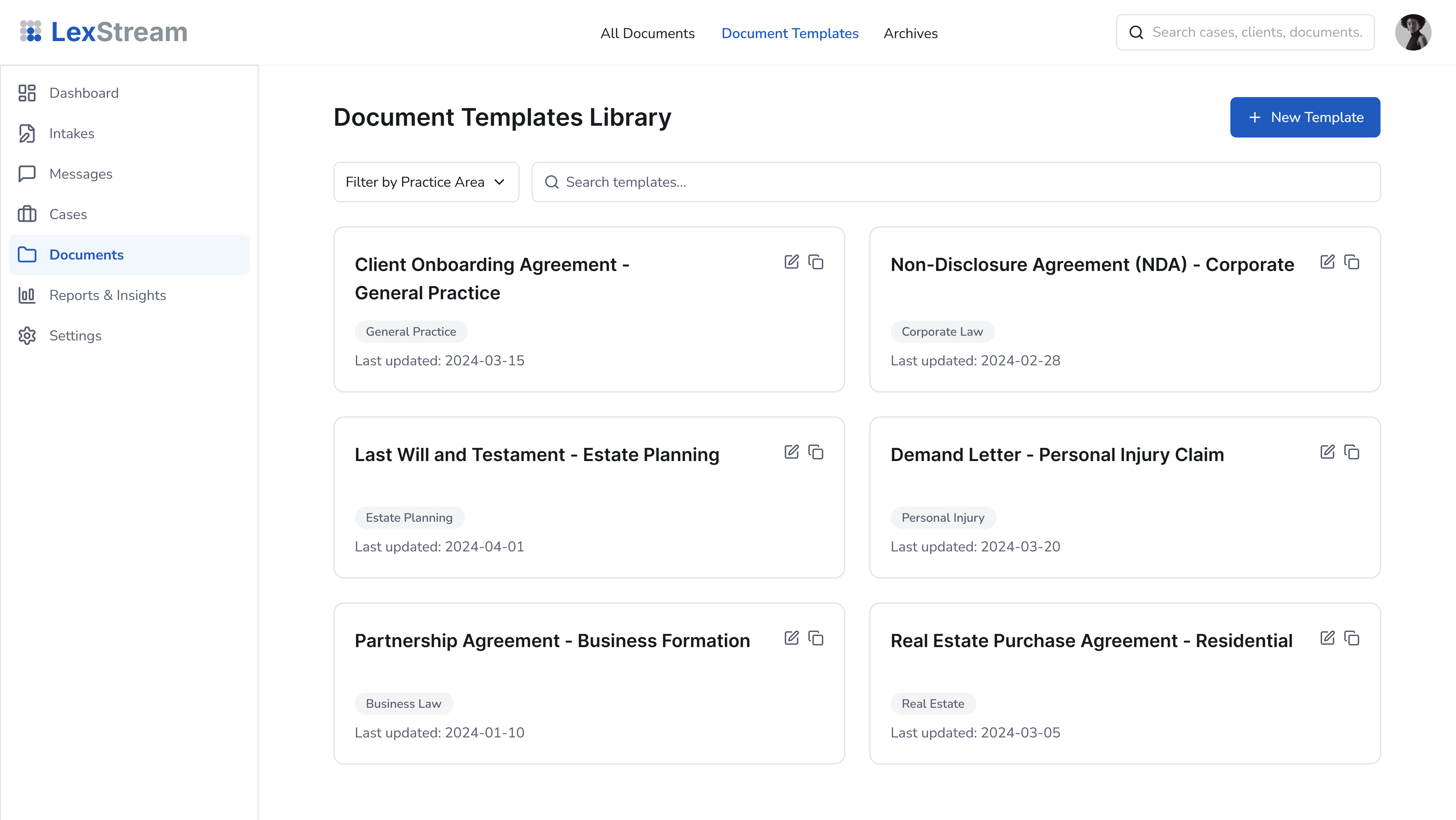 Document Templates Library: The Document Templates Library is where legal productivity meets automation. Instead of drafting routine paperwork from scratch, lawyers can access reusable templates such as retainer agreements, NDAs, affidavits, and settlement letters, all organized by practice area.